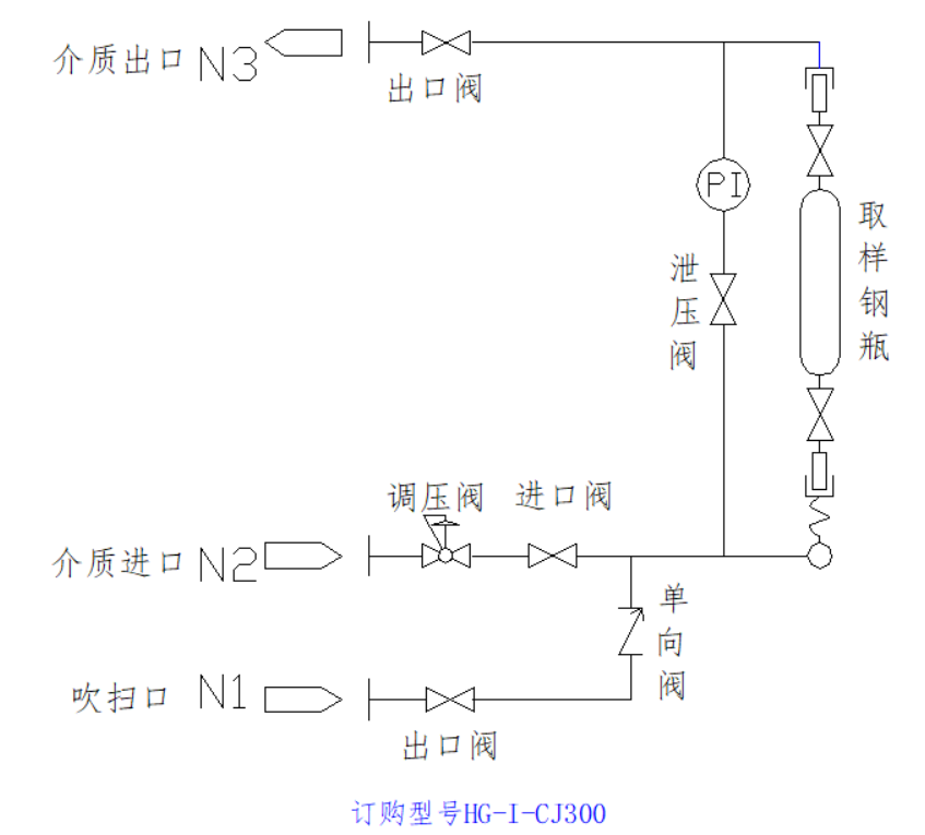 2、为确保采样介质充分填充入采样钢瓶中,采样介质入口与出口必须具备一定的正压差(最少0.01MPa),如没有正压差可用安全可靠的气动泵来循环气体。